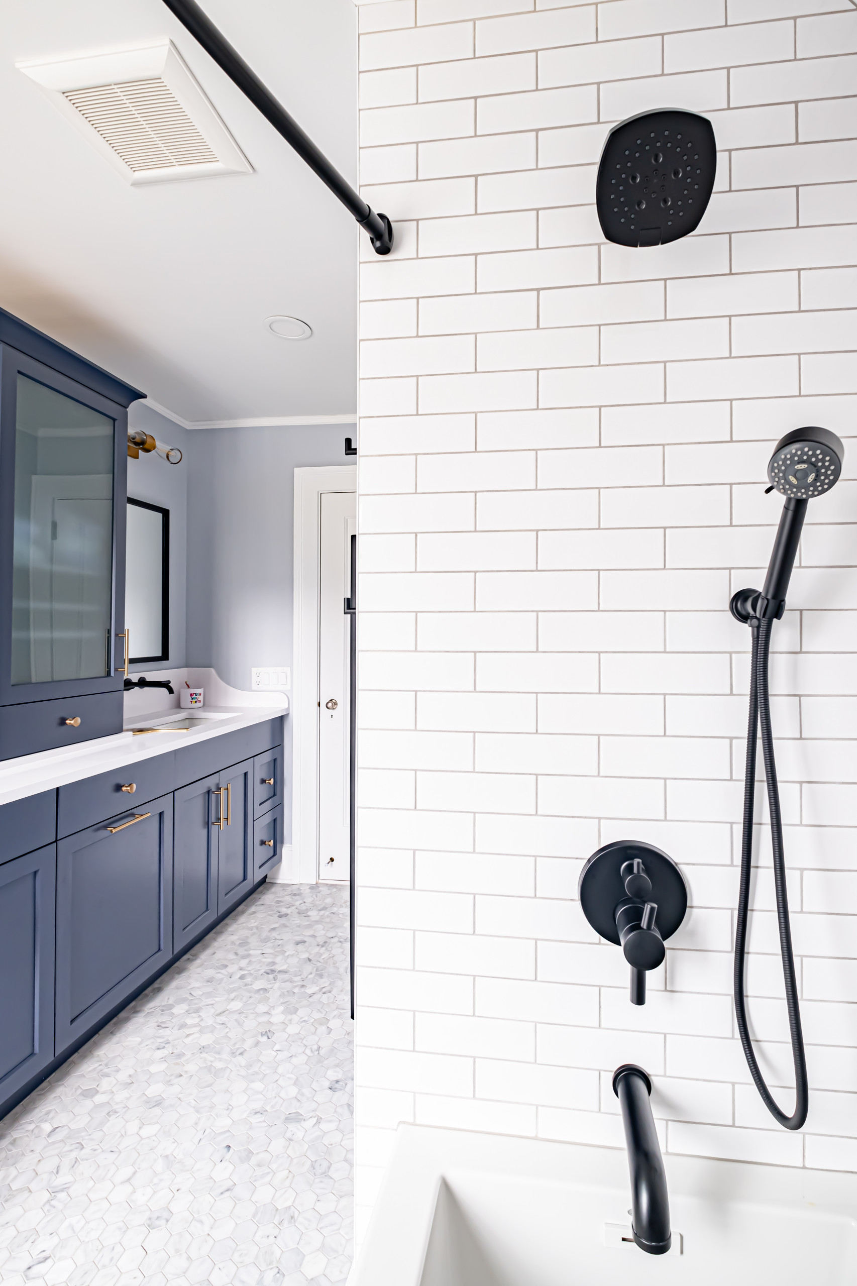 White Subway Tile Shower with Black Fixtures – Modern – Bathroom